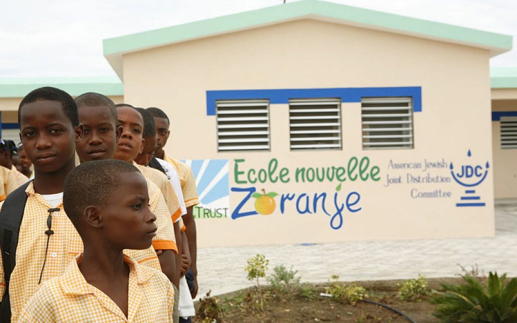 Children from the Haitian town of Zoranje stand outside a school built with part of the $16.2 million donated by Jewish organizations after the deadly 2010 earthquake. (Courtesy of the American Jewish Joint Distribution Committee via JTA)