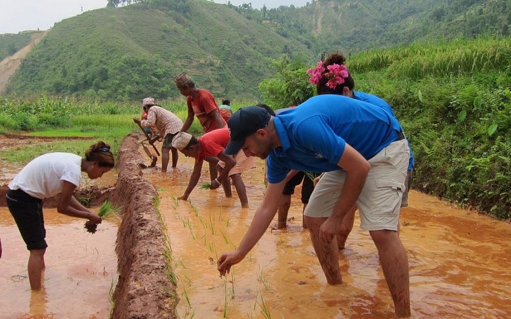 Eliran Douenias, an Israeli fellow with the Joint Distribution Committee based in Kathmandu, joins village members to plant rice. (Eliran Douenias/JDC)